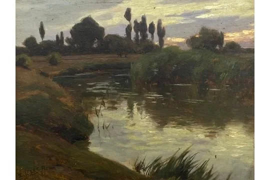 Aladar Edvi Illes (1870-1958), an early 20th century oil on board, riverscape, signed, in a gilt gesso frame. H.34 W.40cm