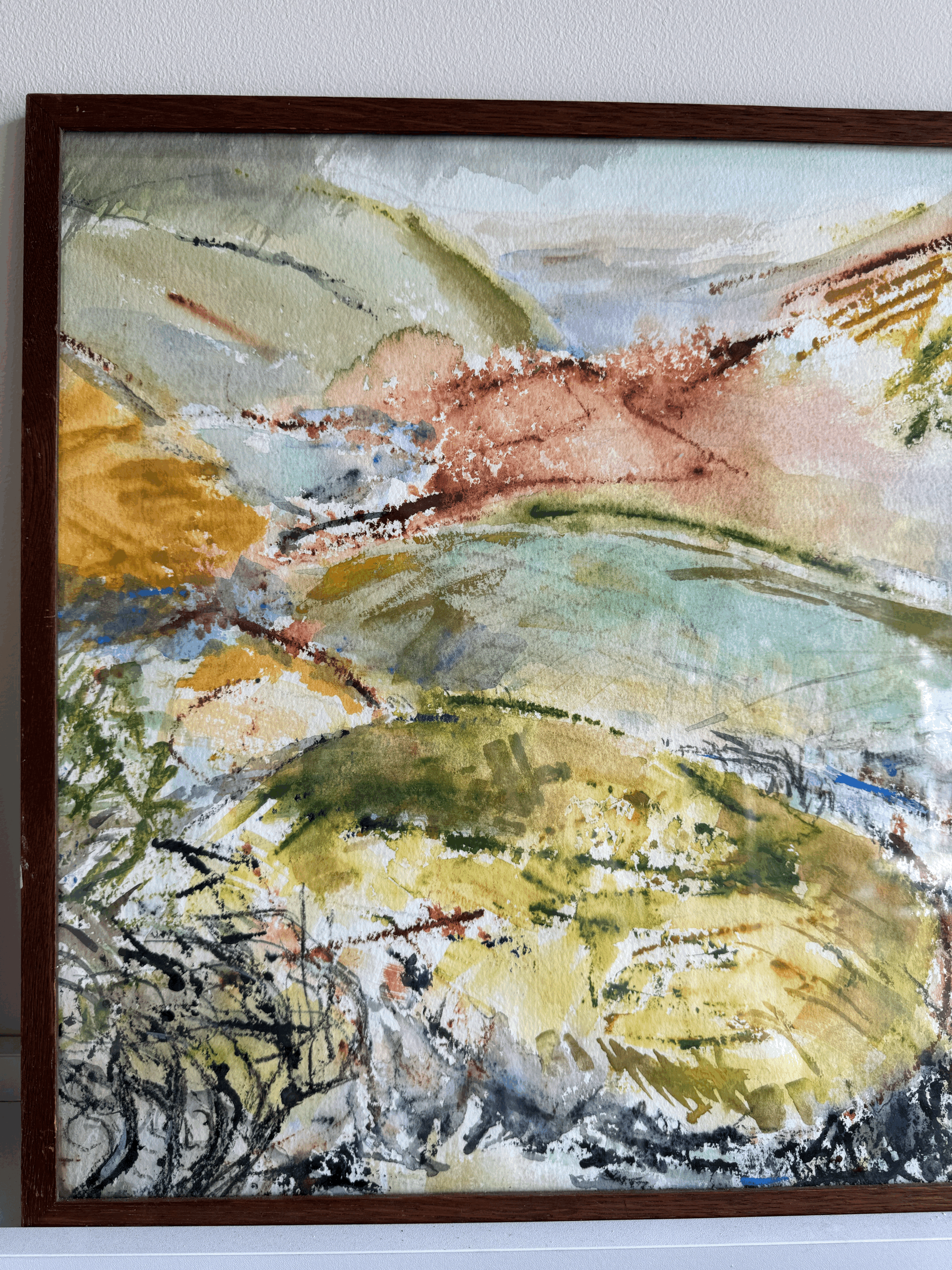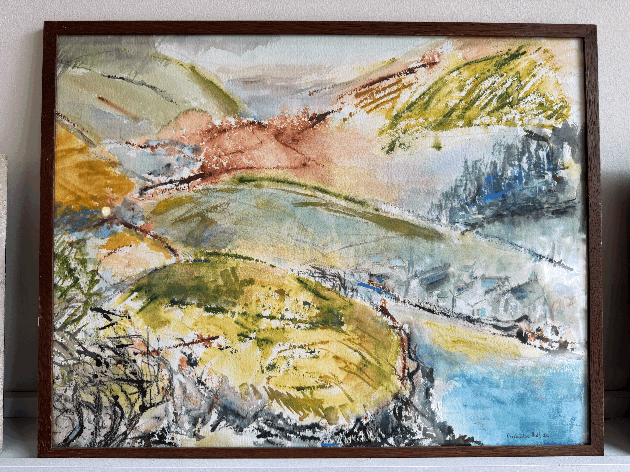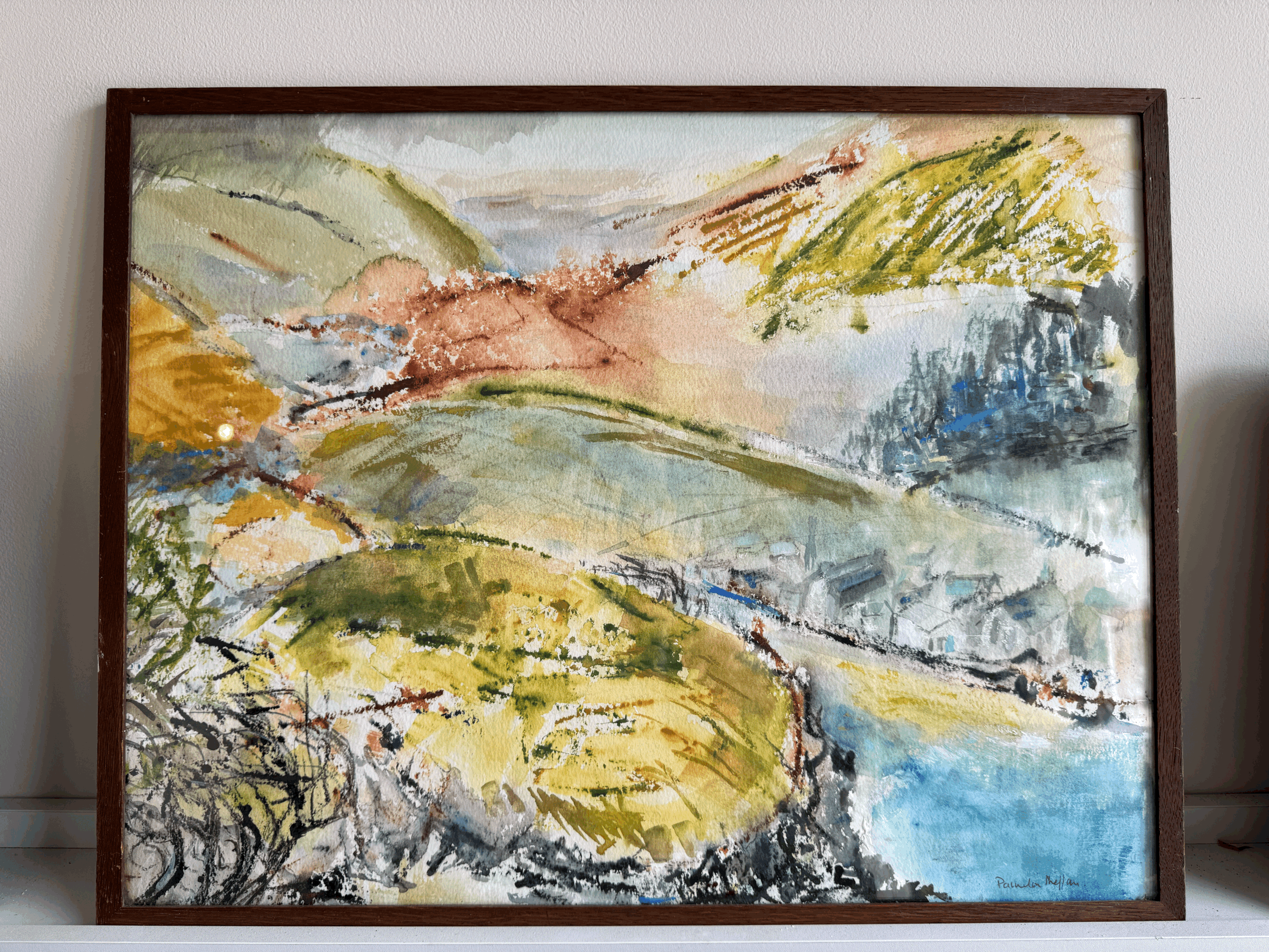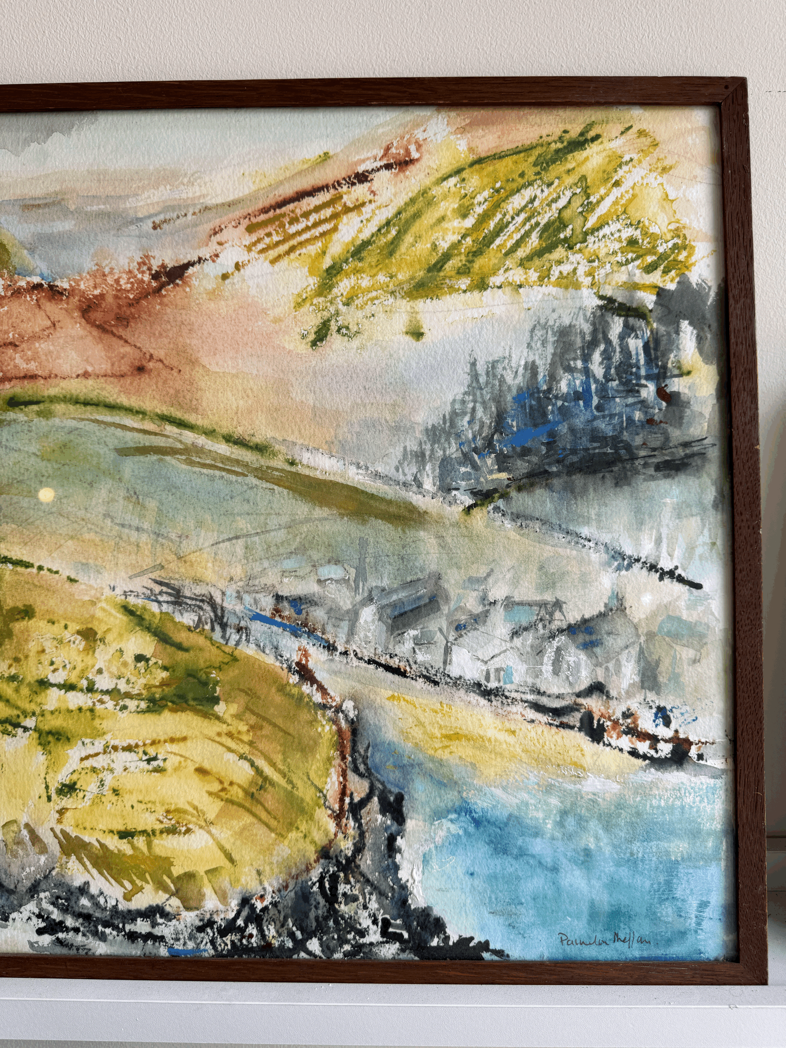 An attractive and colourful vintage watercolour, showing waterfront and rolling hills, signed bottom right.