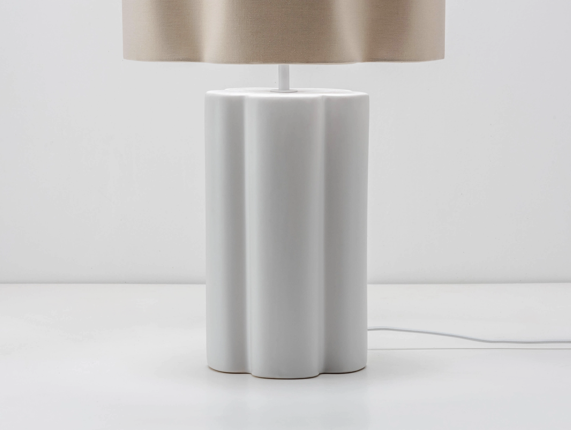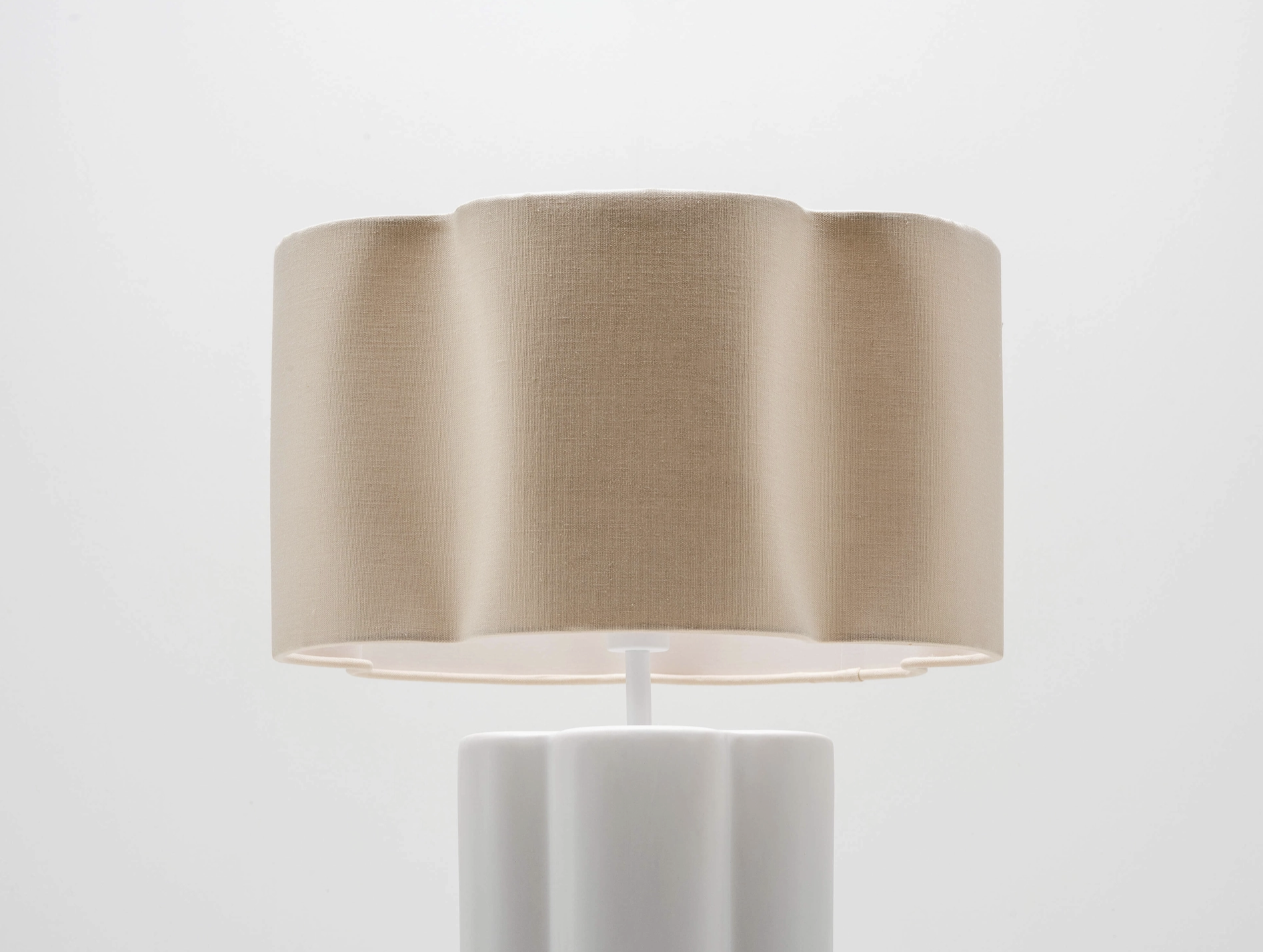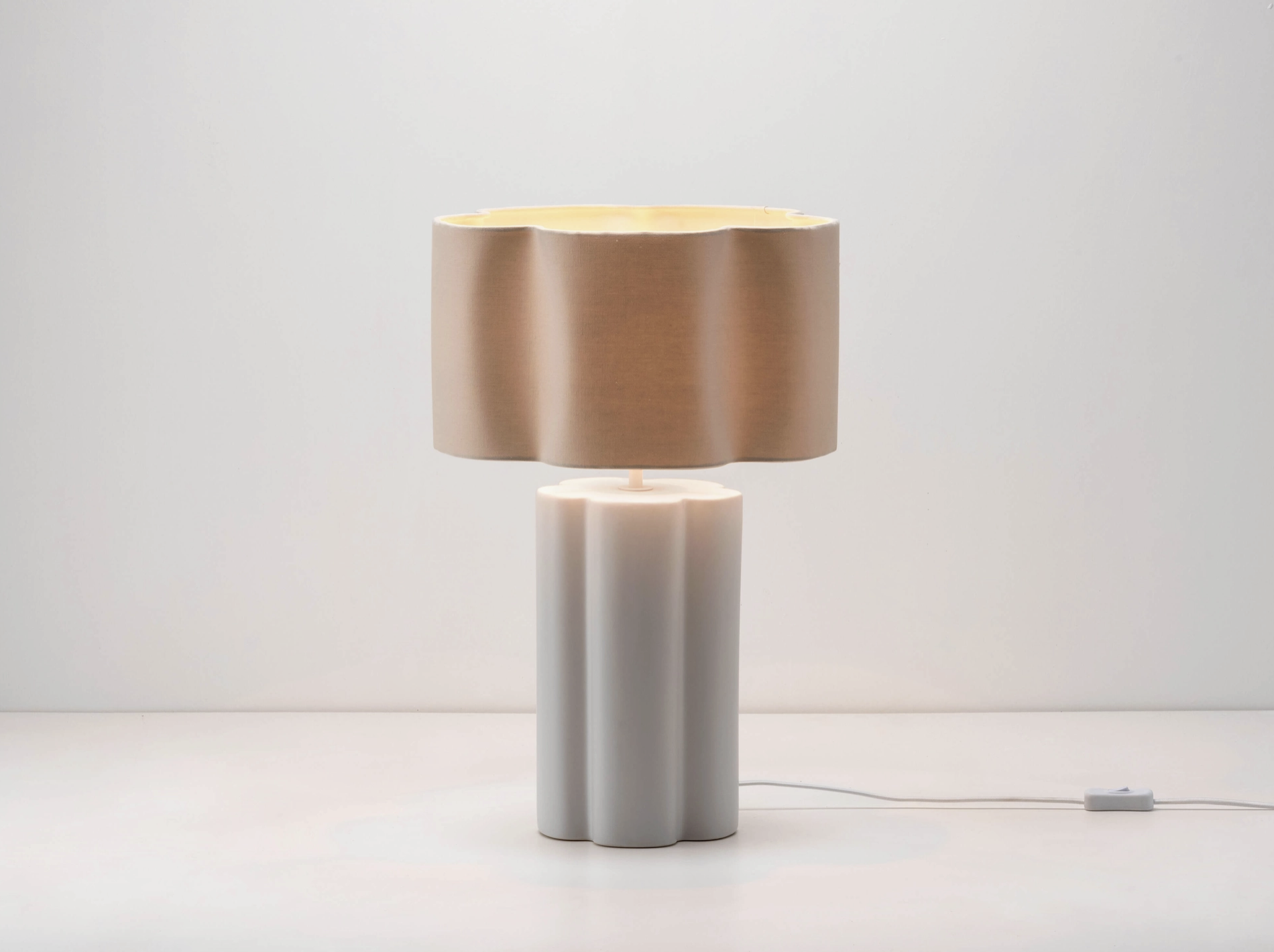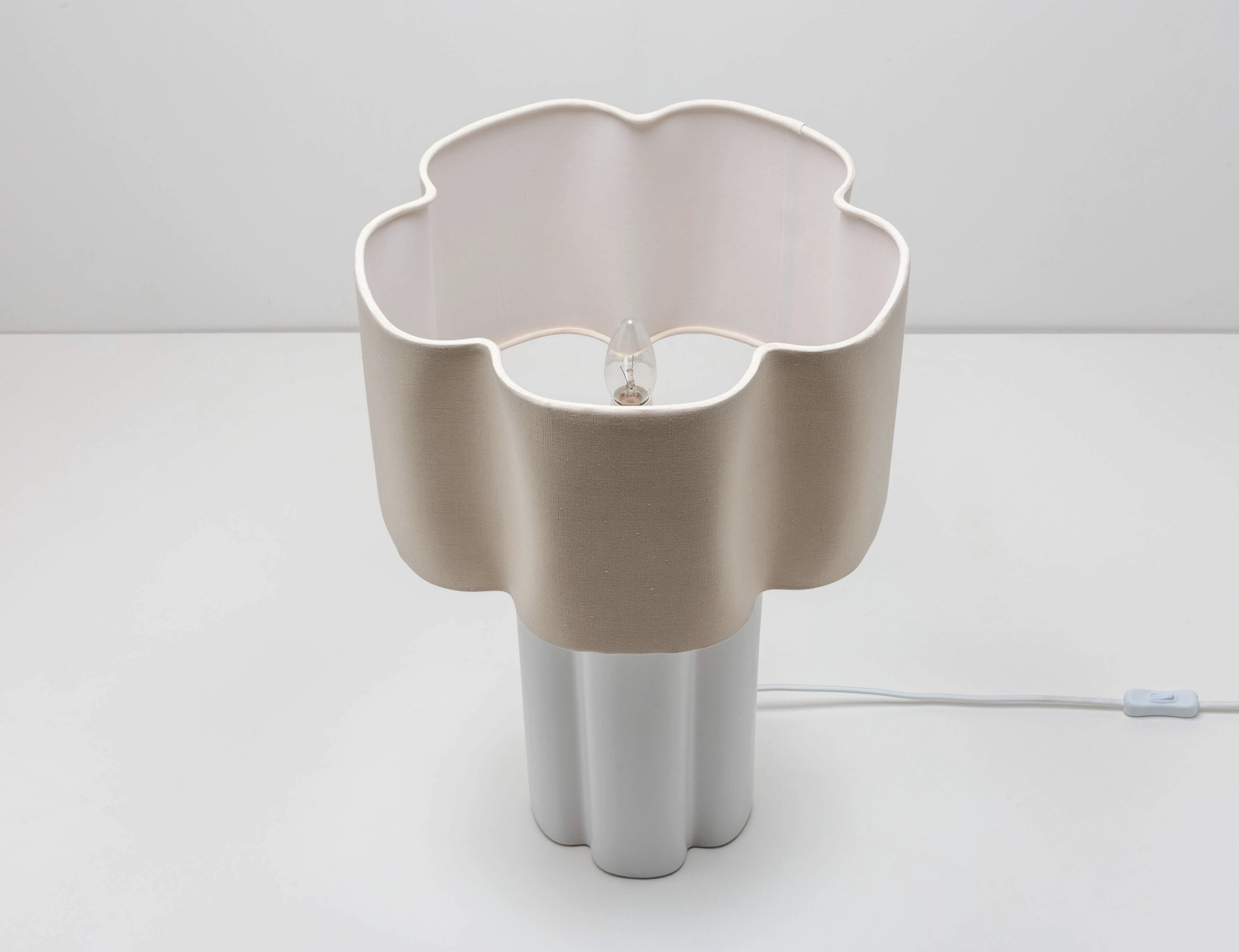 Soften your interior with the natural elements of ceramic and linen. The sculptural ceramic base complements the flower-shaped linen shade. Standing tall at 54cm, this table lamp will make a statement on a sideboard or create warmth in a hallway or bedroom,. Inspired by nature, this ceramic table lamp combines a ceramic base with a natural linen shade to bring a slice of the outdoors into your home. Calming tones envelop this flower shaped sculptural piece which are as elegant as they are soothing.