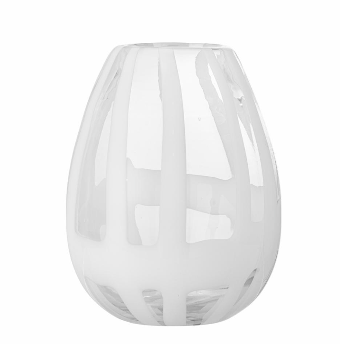 The Cosmin Vase by Bllomingville is a mouthblown vase in clear glass with a white pattern. The vase has a round and classic shape. As it is handcrafted each vase will vary and be unique.