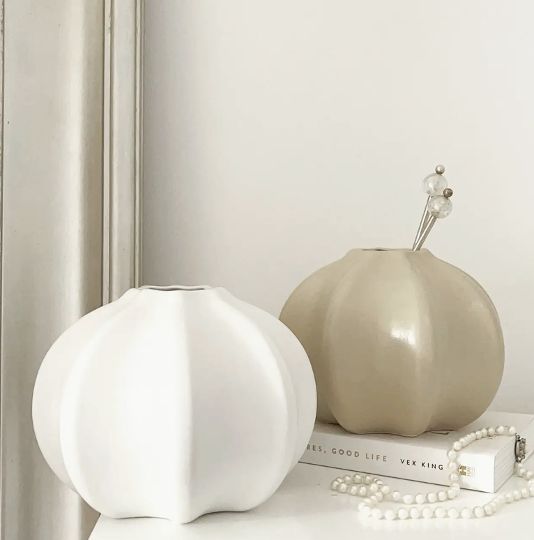 Liana is a pumpkin inspired vase and is absolutely perfect for Autumn and Winter. It comes in a gorgeous matte white and hasdelicate grooves around the exterior. Please note there may be the occasional mark or pin hole where the ceramic has dried unevenly. This is due to the baking method involved in the manufacturing process of this vase and is often the case with ceramic goods. All vases are individually made so there can be variations between items. Please note, any products in the matte oatmeal finish may appear a little uneven in areas. This is the finishing technique for this colour and does not mean the product is faulty. Dimensions- H14 x W16 cm