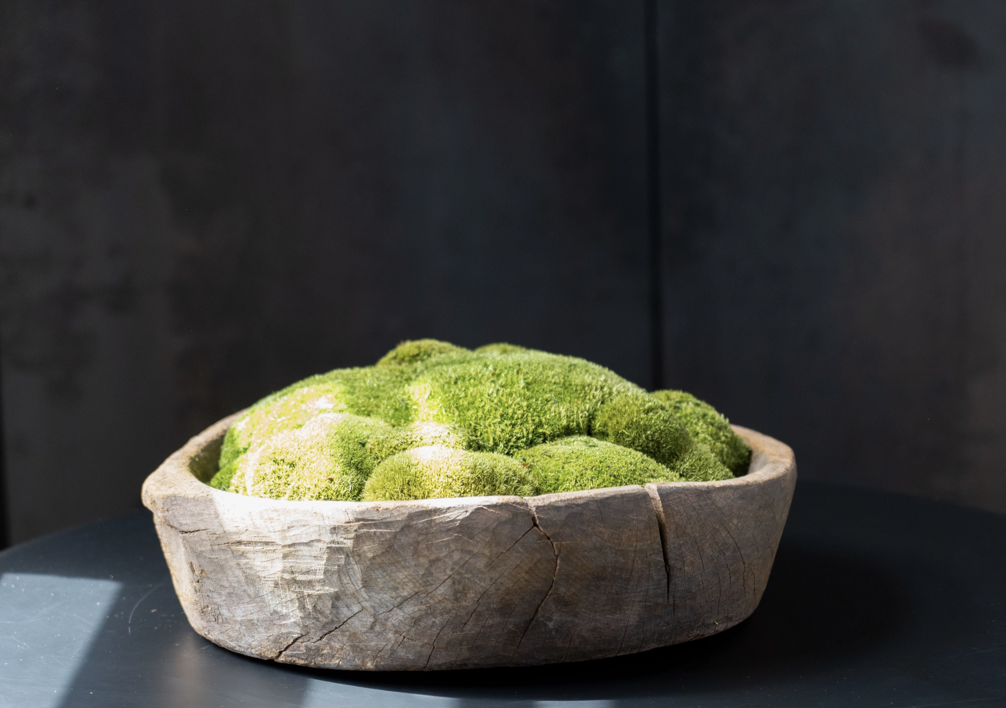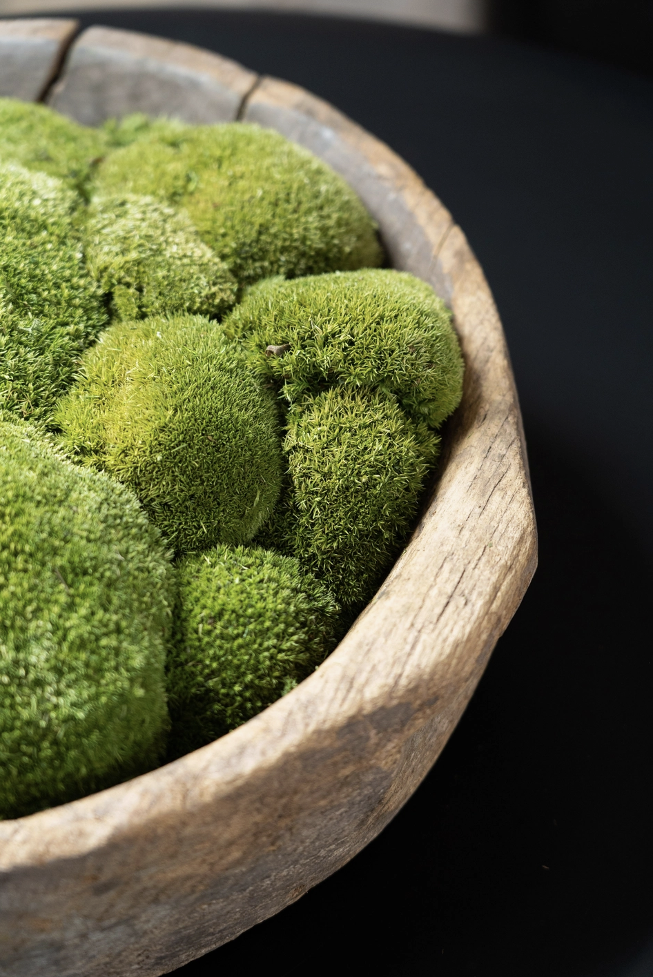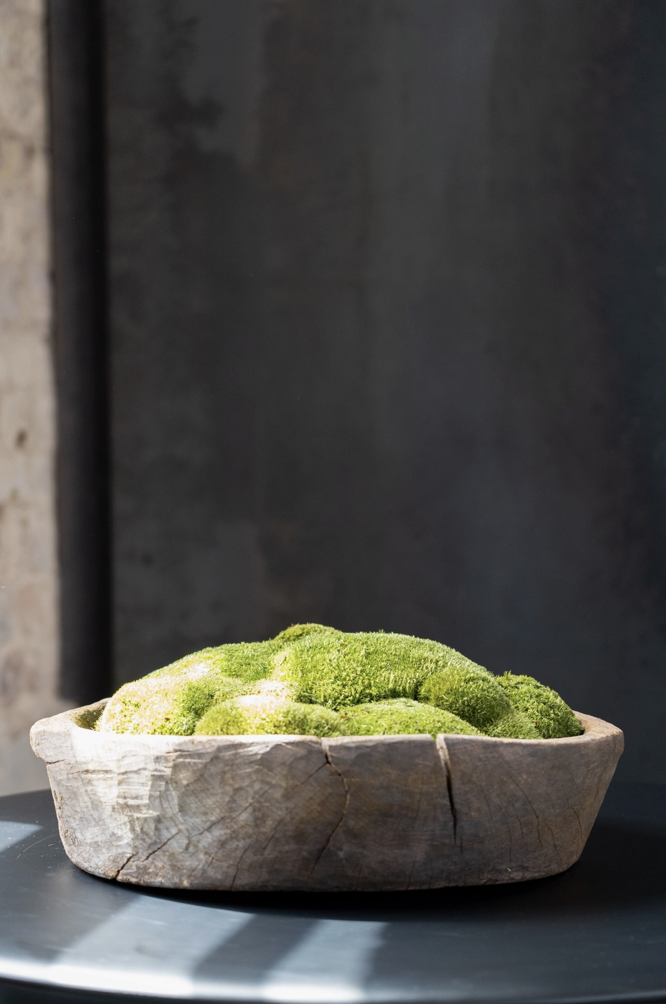 Vintage Wooden Bowl filled with Moss. These can be supplied with or without Moss or preserved Moss. Preserved moss do not require any maintenance. These vintage wooden bowls had a previous life being used in rural parts of Asia as food sharing bowls. Each wooden bowl is unique and will be slightly different to our stock image. Each bowl is handmade and will vary from light to darker shade. The moss sometimes can be darker or lighter depending on our batch arrivals from the manufacturer.