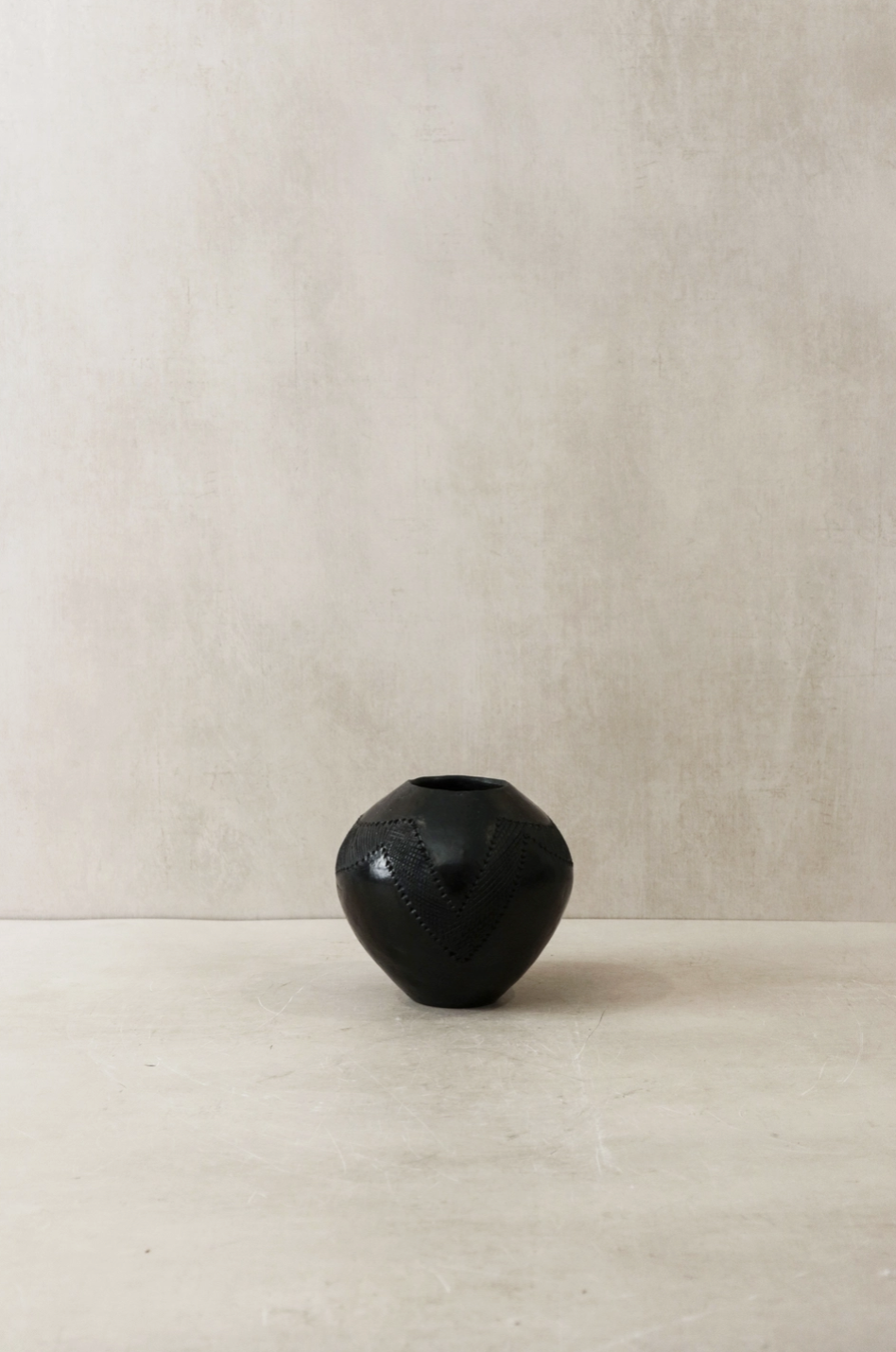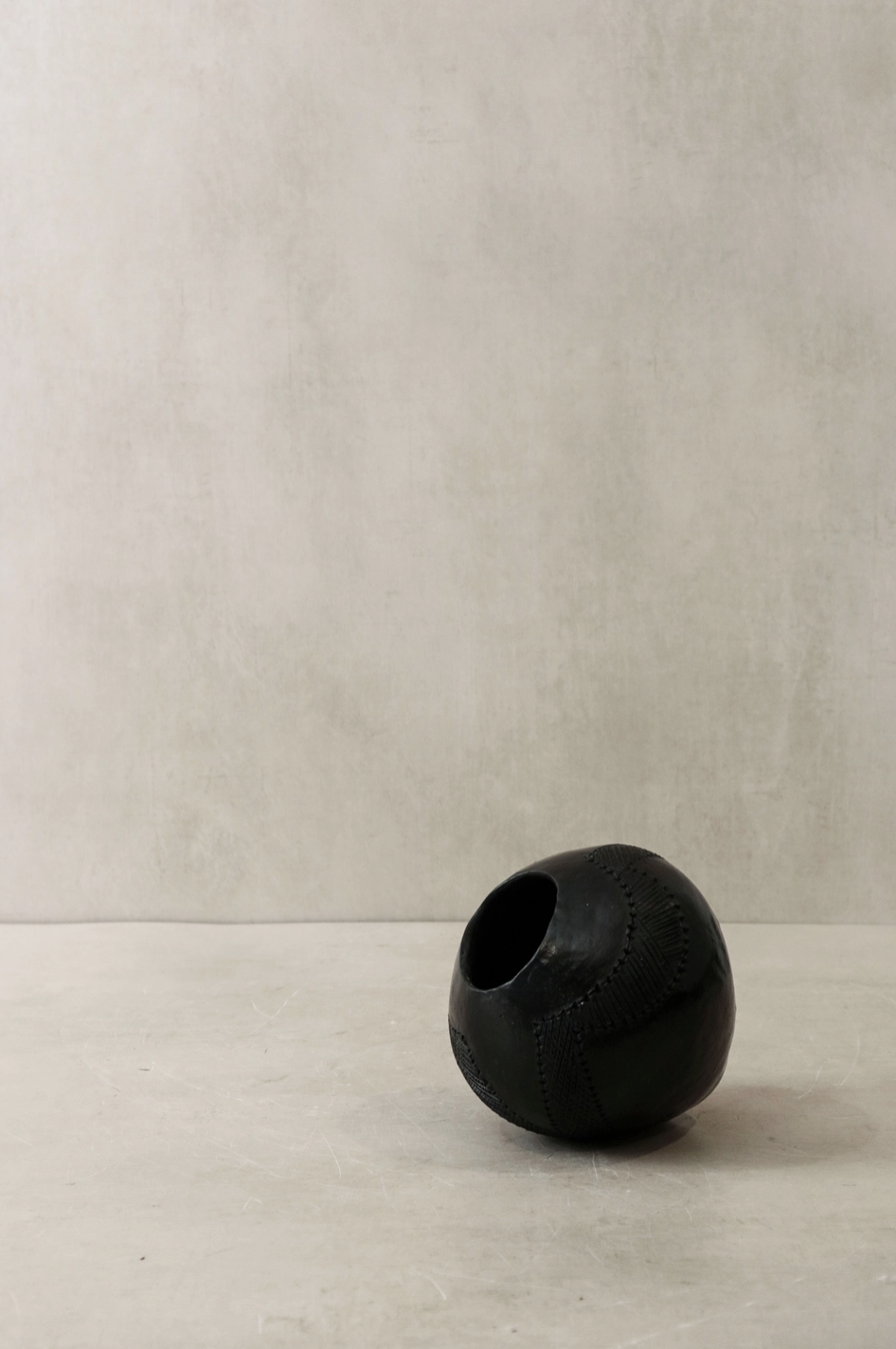 The Zulu pot, originating from South Africa, holds a distinguished role in the traditional practices of the Zulu people, primarily as vessels for the storage and consumption of beer. Crafted meticulously from clay harvested from the banks of local rivers, these pots undergo a meticulous hand-shaping process, followed by careful smoothing, culminating in firing over open-air fire pits. This time-honored technique not only imparts durability but also infuses each vessel with a distinctive character reflective of its artisan's cultural heritage, rendering every pot a unique testament to the rich tapestry of Zulu tradition. Due to their artisanal craftsmanship and antiquity, these pots may exhibit subtle imperfections such as cracks and markings, inherent to their organic origin and manual creation.